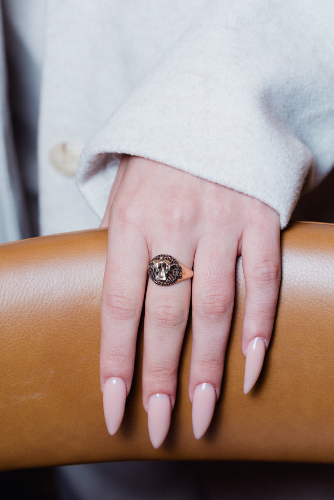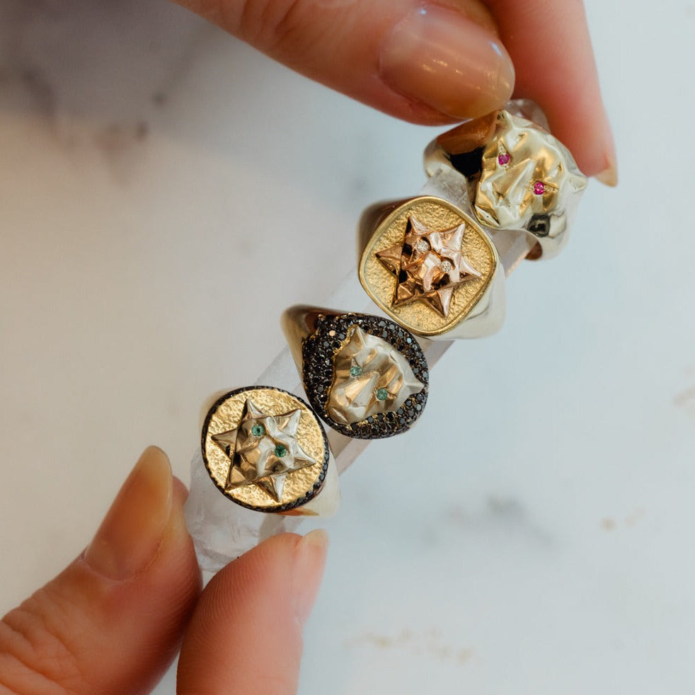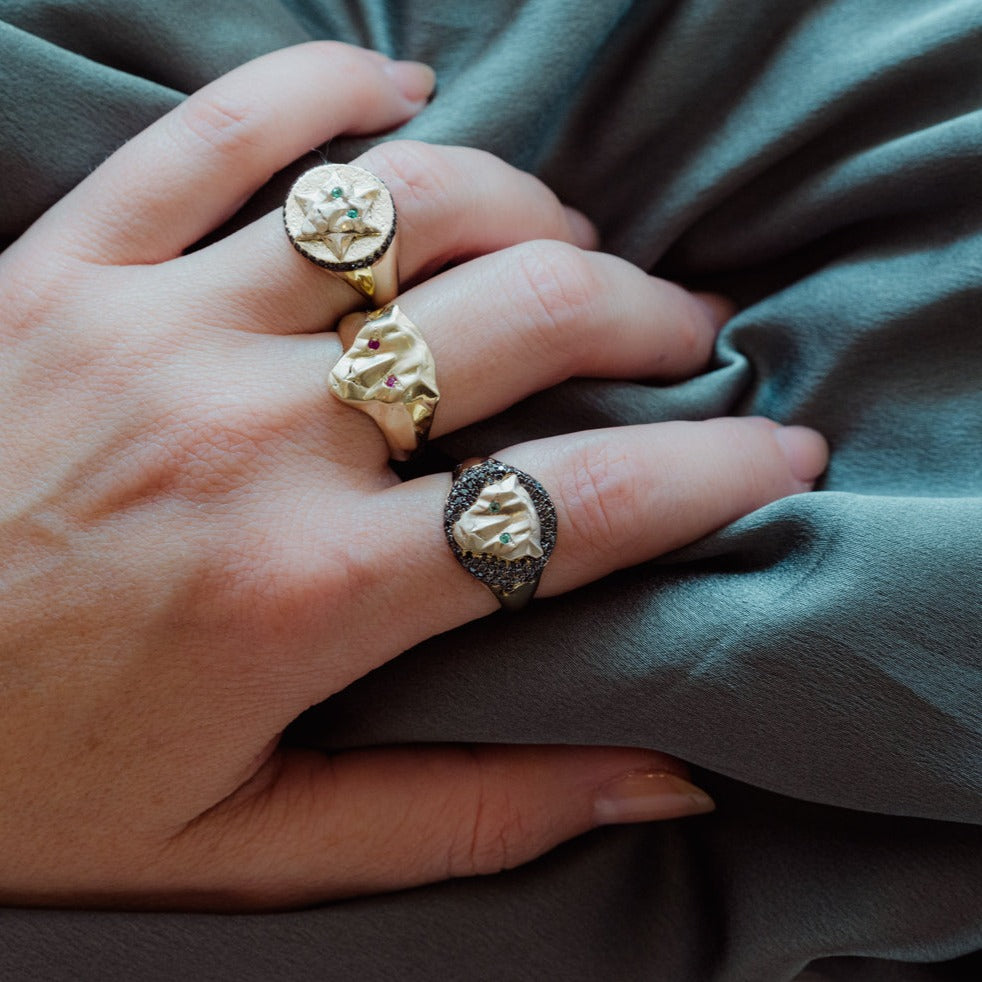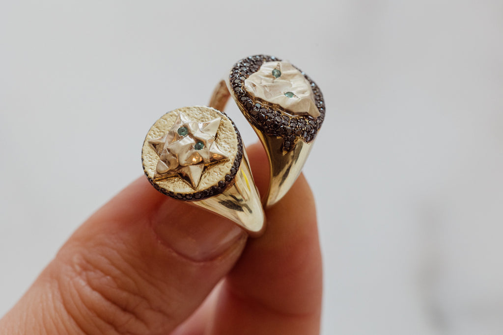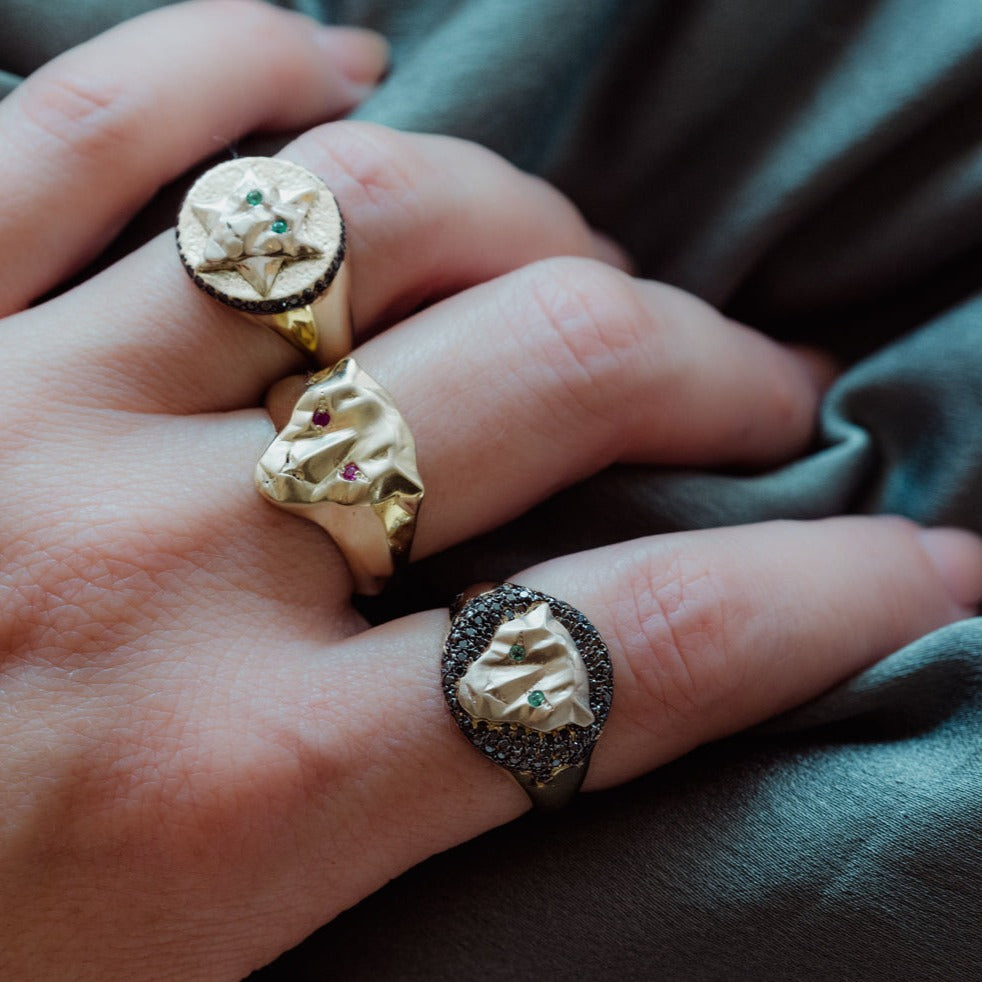 14k gold signet ring with 0.78ct black diamonds and Emerald