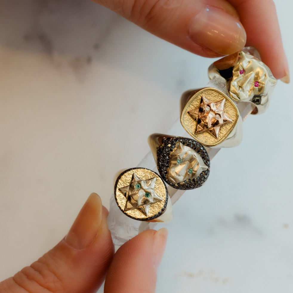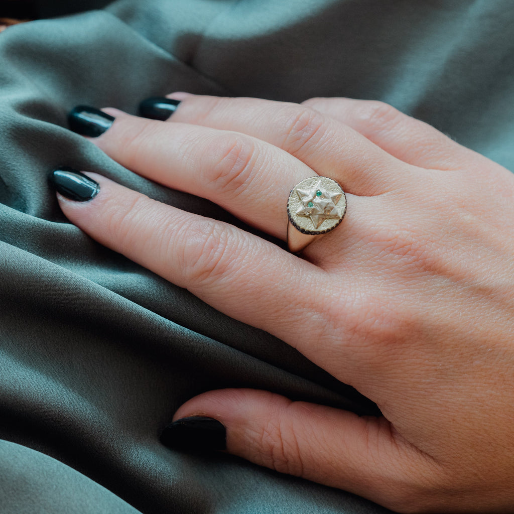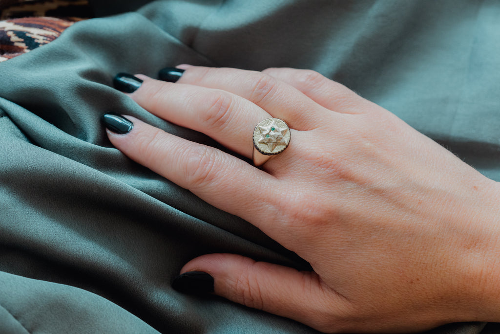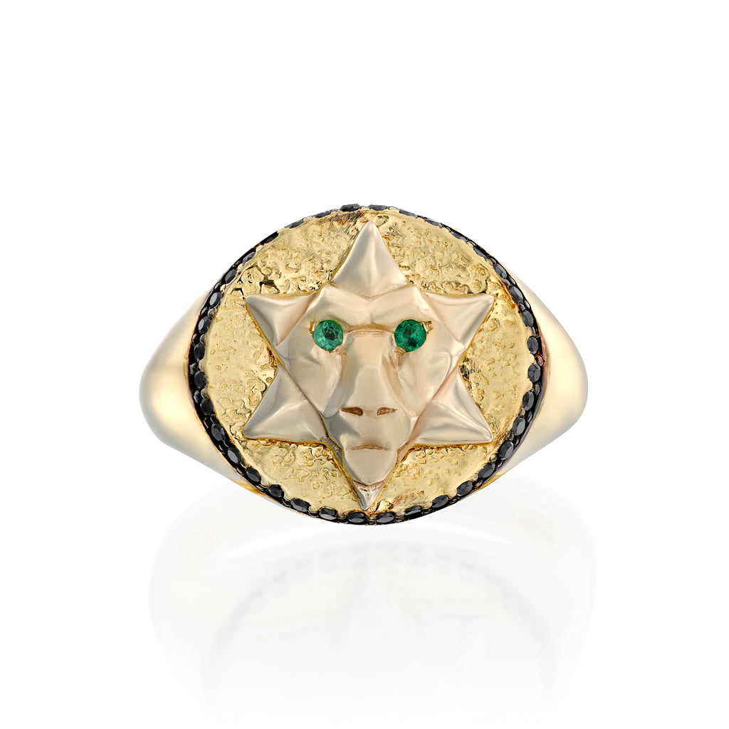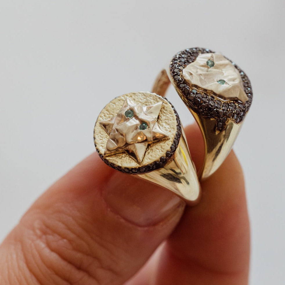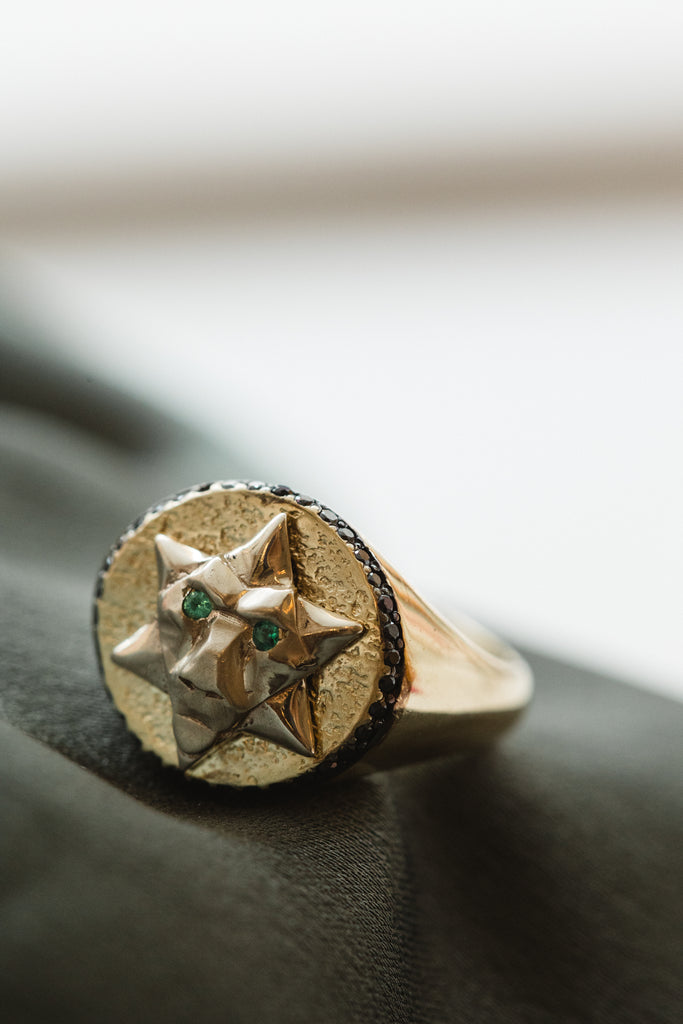 14K gold signet ring with 0.36ct black diamonds and Emerald.