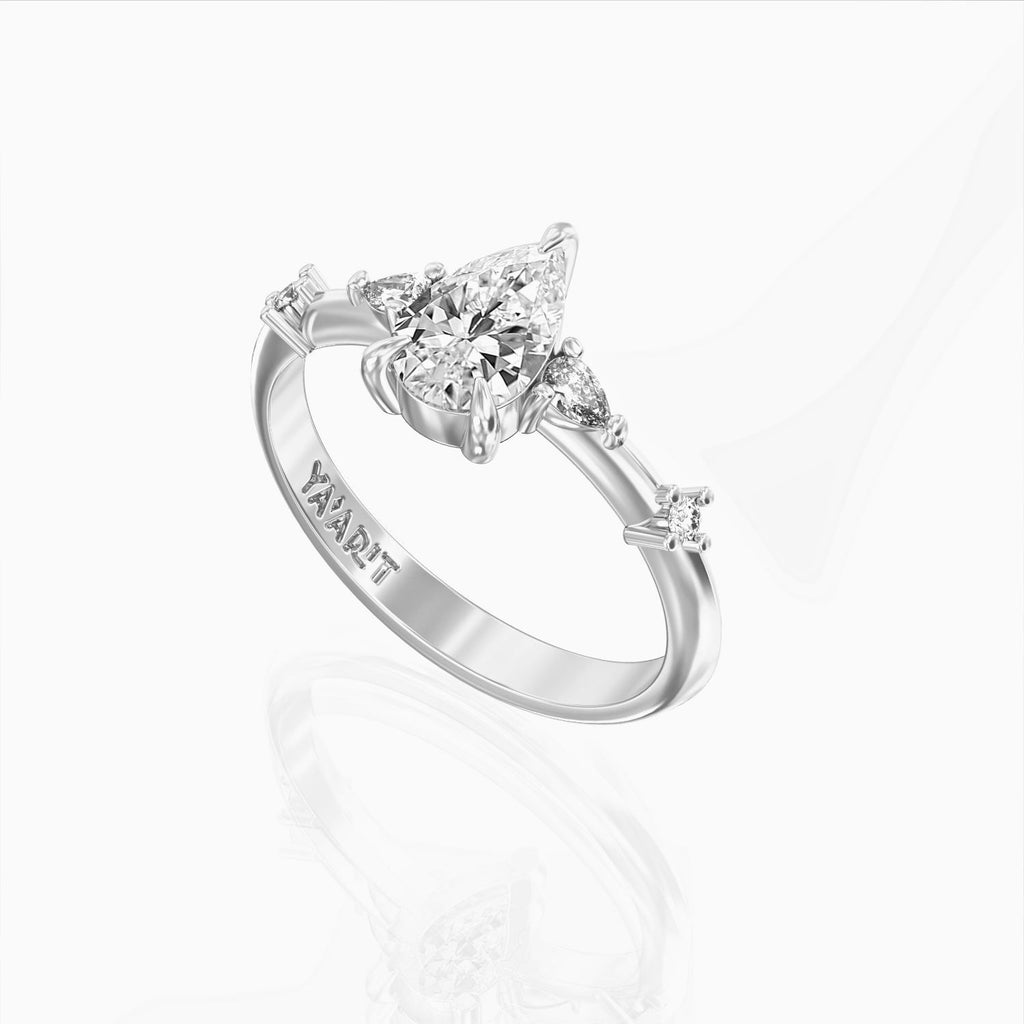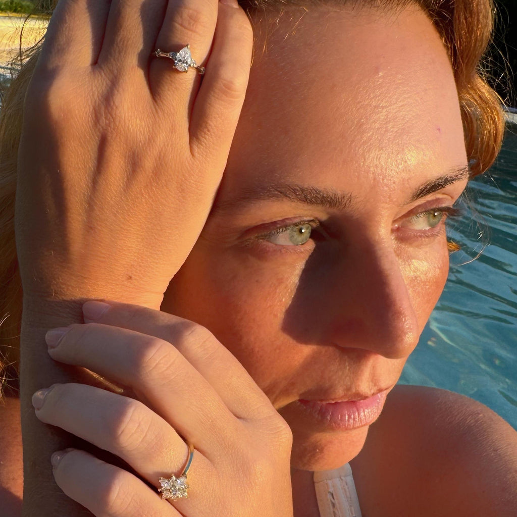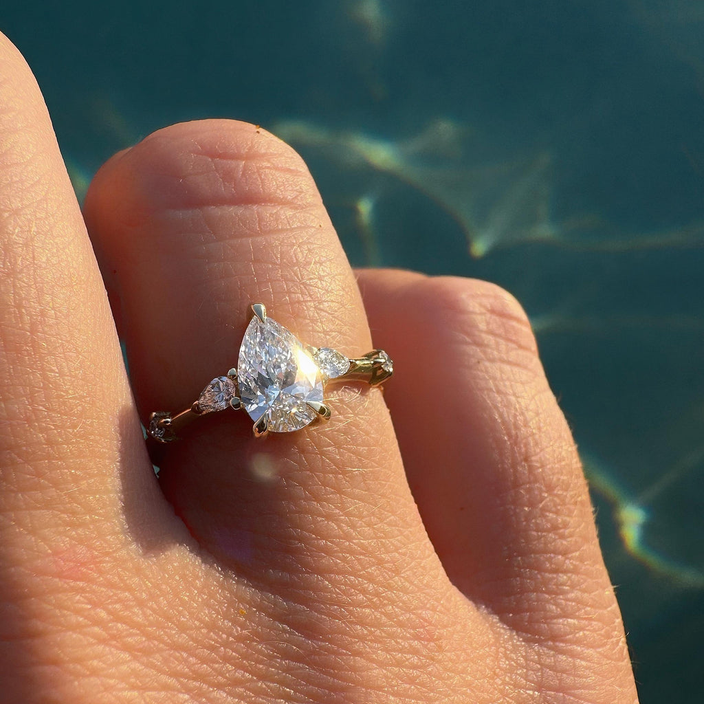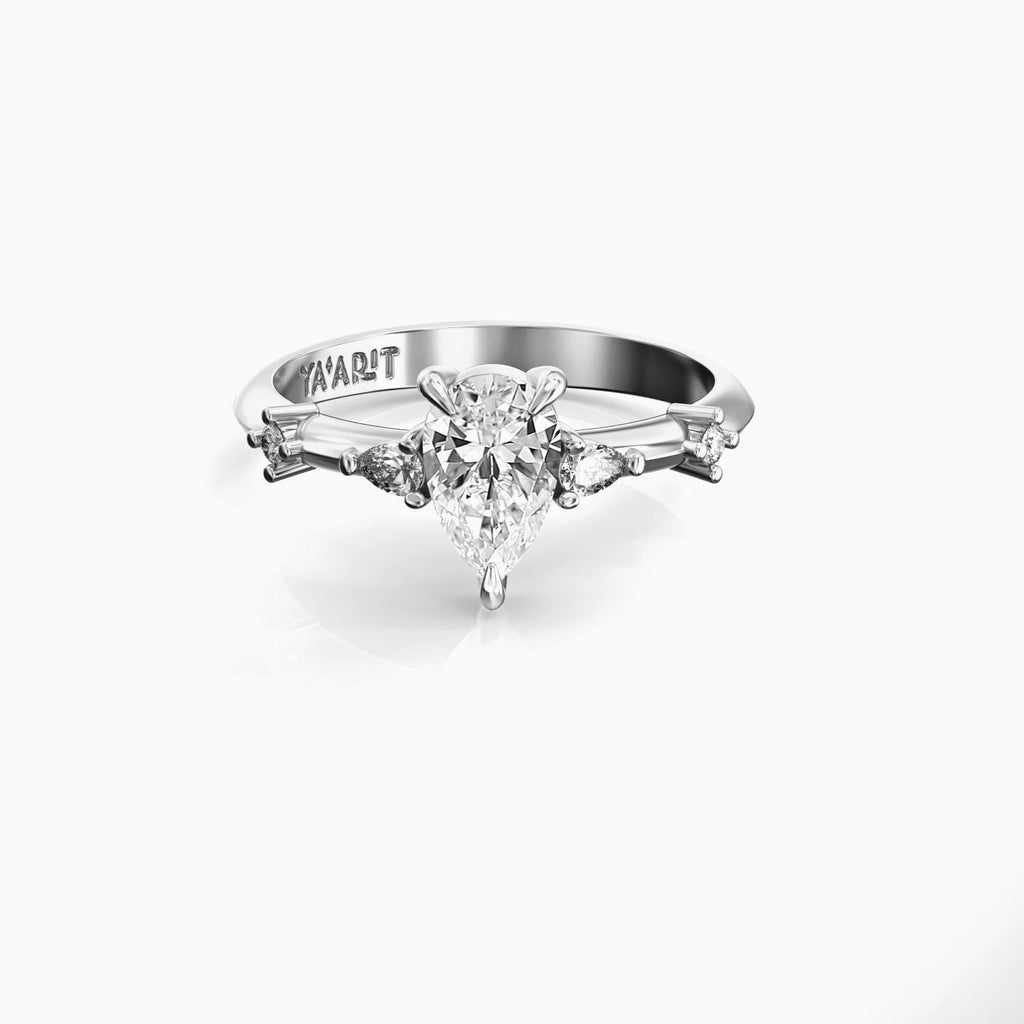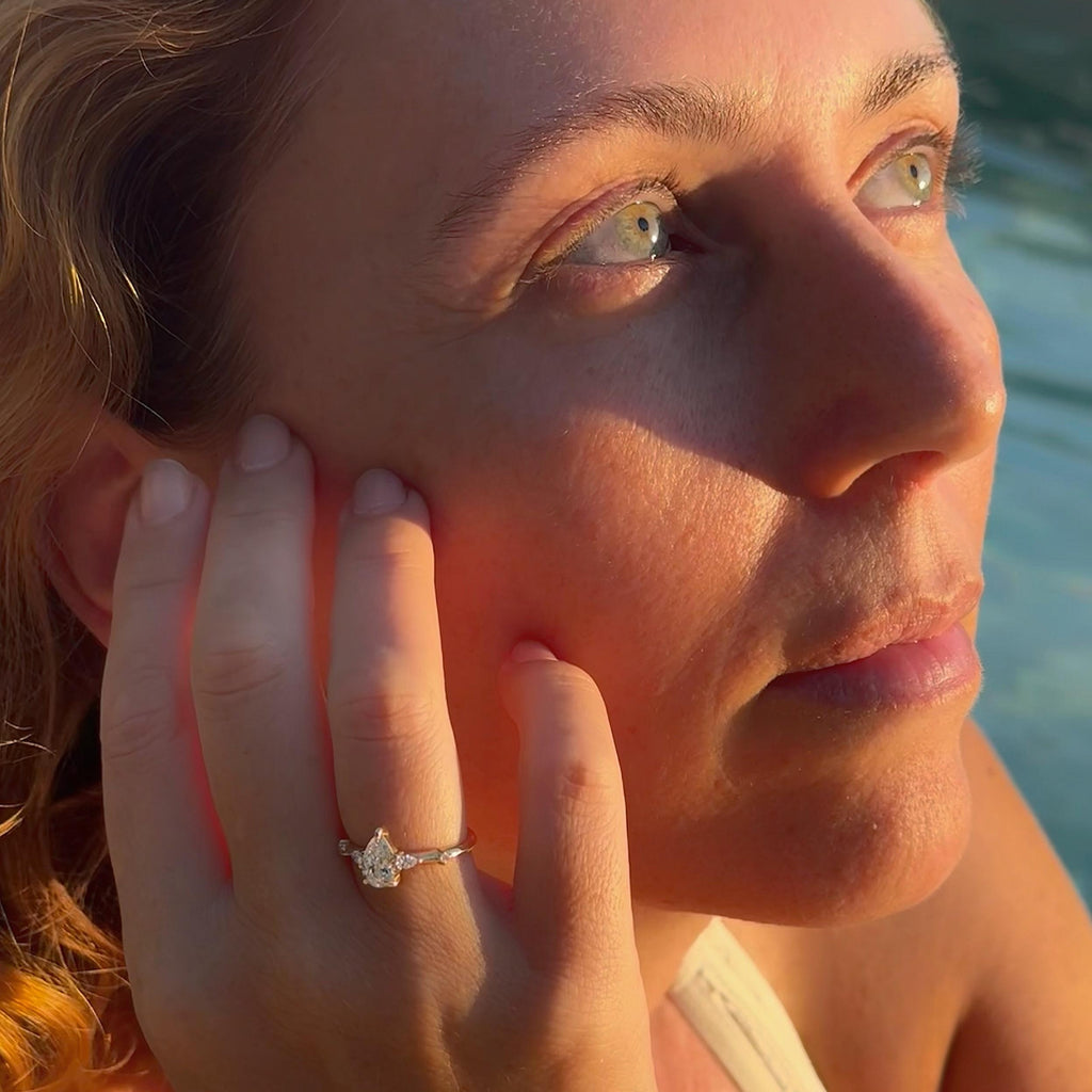Inspired by the purity of a single drop of light, this ring symbolizes love, renewal, and connection. Perfect as a pear-cut engagement ring, an anniversary jewel, or a unique statement piece, it offers both sophistication and poetic charm.